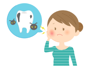食べ物や飲み物によってお口の中が酸性になると歯は溶け始めます(脱灰)。通常は唾液のカルシウムやリンによって再石灰化されますが、ダラダラ食べや飲食回数の多さで再石灰化が追いつかないと、歯に穴が開くことがあります。この場合は治療が必要になります。