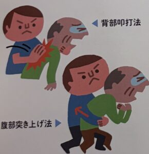 「声やせきが出ず、顔色が悪くなる」のは窒息の典型的なサインです。このようなときは、「背部叩打法」や「胸部突き上げ法」を行います。